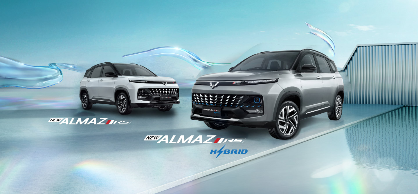 Wuling New Almaz RS tampil perdana dengan dua varian, yakni 1.500 cc turbocharged dengan transmisi CVT yang smooth dan responsif untuk New Almaz RS Pro, sedangkan mesin 2.000 cc hybrid dengan Dedicated Hybrid Transmission yang memiliki performa tinggi dan efisien diaplikasikan pada New Almaz RS Hybrid. Perbedaan keduanya secara umum terletak terletak pada aksen biru pada grille depan dan penyematan logo hybrid pada bagian pintu bagasi.