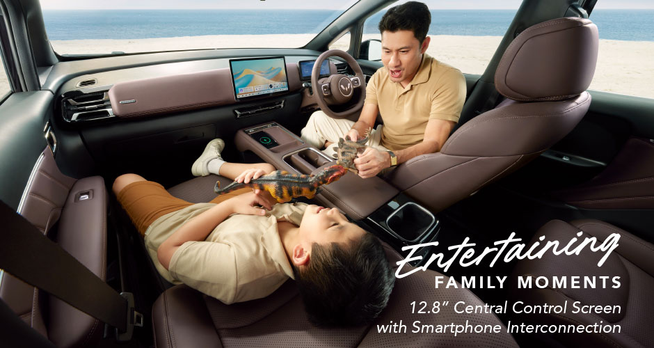 Sebagai MPV keluarga, Darion menawarkan kabin yang luas dengan konfigurasi 2+2+3 yang mendukung kenyamanan seluruh penumpang. Pada varian EX, kursi baris kedua dilengkapi ventilated electric captain seat untuk kenyamanan ekstra. Fitur Auto-Comfort Sliding Door mempermudah akses keluar masuk kendaraan. Interior dua warna Walnut Brown dan Carbon Black dengan material kulit sintetis lembut menambah kesan premium dan hangat.