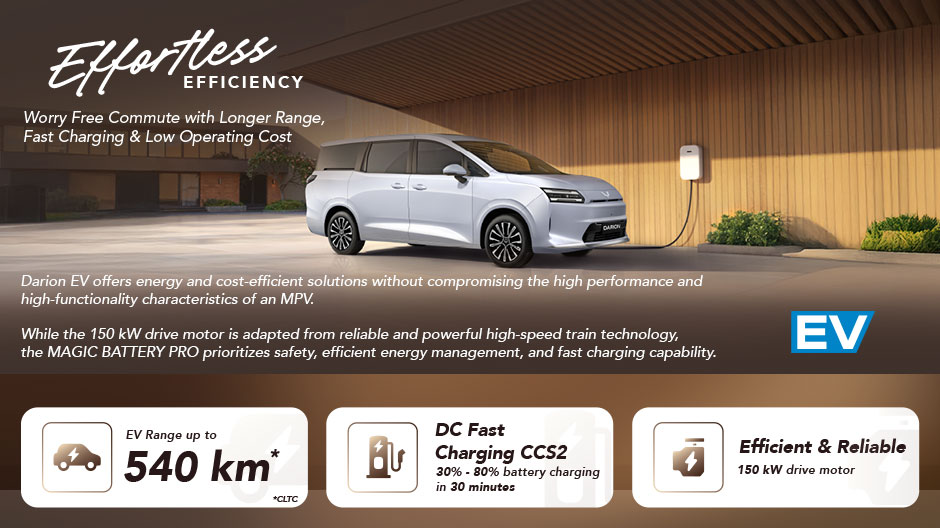 Dari sisi performa, Darion menawarkan dua pilihan elektrifikasi. Varian EV membawa motor listrik 150 kW yang dipasangkan dengan MAGIC Battery Pro berjarak tempuh hingga 540 km (CLTC) dan mendukung DC Fast Charging. Sementara varian PHEV mengusung teknologi LING Power yang memadukan mesin 1.498 cc dengan Dedicated Hybrid Transmission (DHT), sehingga memberikan efisiensi optimal sekaligus kemampuan menempuh jarak hingga 1.000 km secara kombinasi, termasuk 125 km (CLTC) dalam mode full EV.
