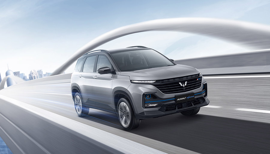 Almaz Hybrid mengusung tampilan Sophisticated Design yang modern dan sporty didukung 18 inch Alloy Wheels dan Dynamic Blue Line pada bagian fascia SUV ini 1000x569